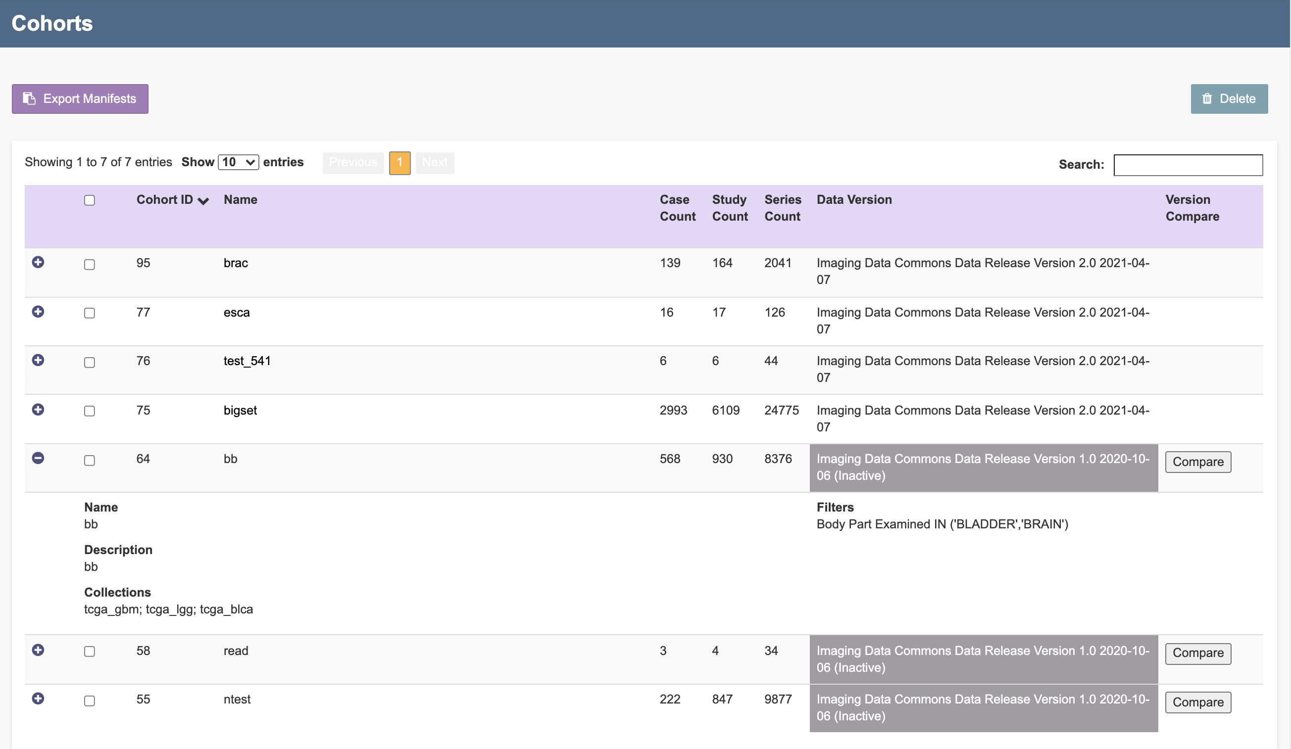Clicking "Manifest" button in the "Cohort Filters" panel will given you the manifest for all of the studies that match your current selection criteria.